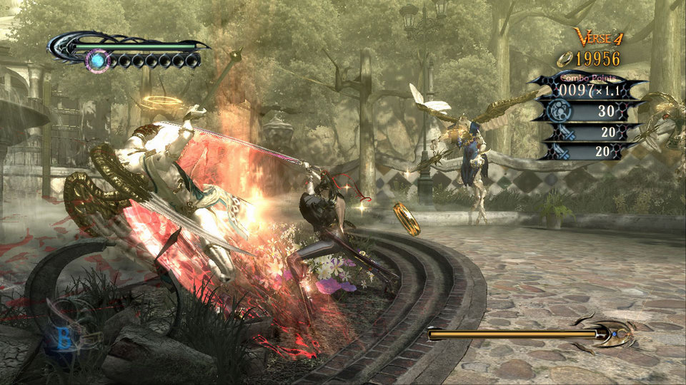 遊戲具備流暢的操作性與魄力的動作場面,蓓優妮塔可施展拳 / 腳 / 武器 3 種攻擊,藉由背上隱藏的蝶翼來施展 2 段跳,或是無視重力在牆壁與天花板上奔走。玩家可自由組合 3 種不同攻擊來構成連段,順利的話即可施展「魔女編織」或「大魔獸召喚」。