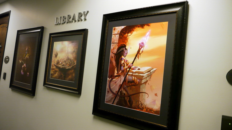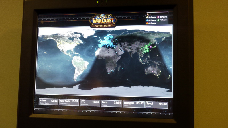 | 研發辦公室牆上的畫作 | 在會議室外牆壁發現有關魔獸世界各地伺服器玩家分布的世界地圖 |