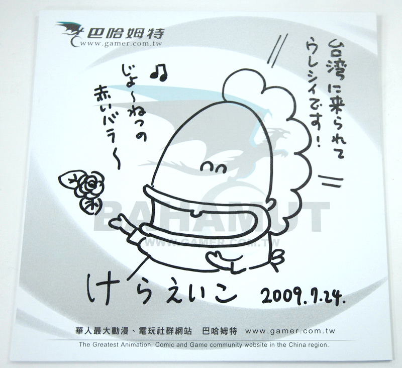 ![漫畫家けらえいこ贈與巴哈姆特的繪圖及簽名,花媽:「能夠來到台灣真的很開心!」]() |