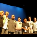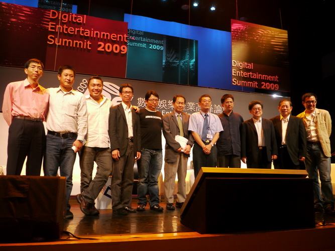 | 論壇參與者合影,由左至右為宇峻奧汀總經理居則文、華義國際董事長黃博弘、遊戲橘子集團執行長劉柏園、動畫產學共同開發聯盟總召集施文祥、遊戲產業振興會會長許金龍、台北科技大學工設系副教授曲立全、台北縣經發局副局長黃正誠、台北縣經發局主秘陳耀東、經濟部數位內容推動辦公室主任許清琦、智冠董事長王俊博、東吳大學社會系副教授劉維公 |