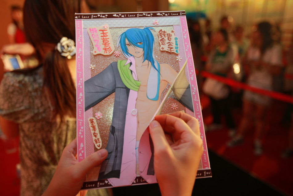 純金貴公子》中的男主角「玉慕杉」的卡片,只要把卡片上主角的衣服脫掉,就可以看到臉紅心跳的圖像,充滿 KUSO 的創意,讓老師和台下的漫迷們都感到非常有趣。