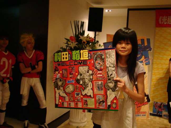 為了歡迎兩位作者來台,東立出版社特地邀請到了世新大學啦啦隊現場進行一段熱情有勁的啦啦隊表演,此外也派出作品中各學校代表、還有扮演漫畫中的靈魂人物的「小早川瀨那」與「蛭魔妖一」一同迎接他們。