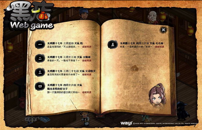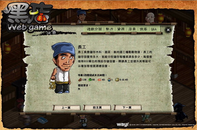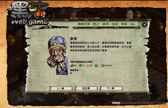 黑店 Web 》是款以客棧經營為主要的即時戰略網頁遊戲,玩家可以聘請擁有各式各樣專長的夥計加入客棧,例如儲存木料蔬菜等戰略物資的長工、負責玩家間物資運輸貿易的帳房等共 19 種專才。玩家將客棧經營養成後,依循著「生存、對抗、結盟、反攻、爭霸」五大階段軸線,深入其境,享受猶如締造武俠連續劇般的樂趣。