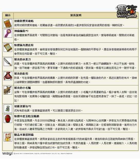 在遊戲主幹骨架外,也加上了眾多豐富逗趣的元素,包含婆婆媽媽喜愛的「四大暗器」、可怯傷、解鬱、通血、透中氣的「鐵牛運功散」、能使自家客棧英雄好漢各個脫衣卸甲的香豔火辣「野球拳」等,數十種五花八門的道具;可安排單身俠客婚姻大事、生兒育女,甚至培養出更強大下一代賣命的遊戲功能;能將整座城市從台北搬到紐西蘭,重新開創新局的「遷店符」道具功能;回答俠女日記內容的評鑑測驗,可獲取高等物資的趣味內容;以及攻打黑店客棧會產生仇恨值,仇恨直飆高會引來報復等多元豐富的情節。