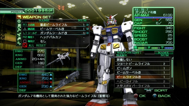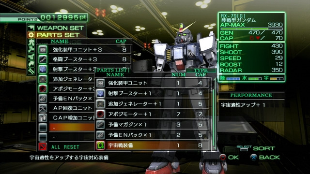始於陸戰的本作也會有宇宙戰的關卡登場,當玩家挑戰宇宙戰關卡時,應該已經獲得強力的武器與裝備,可以使用這些裝備來進行機體自訂以強化戰力。不適合宇宙戰用的陸戰用 MS 只要在機體自訂時裝上「宇宙戰裝備」,就能保有與陸地上相同的戰力。