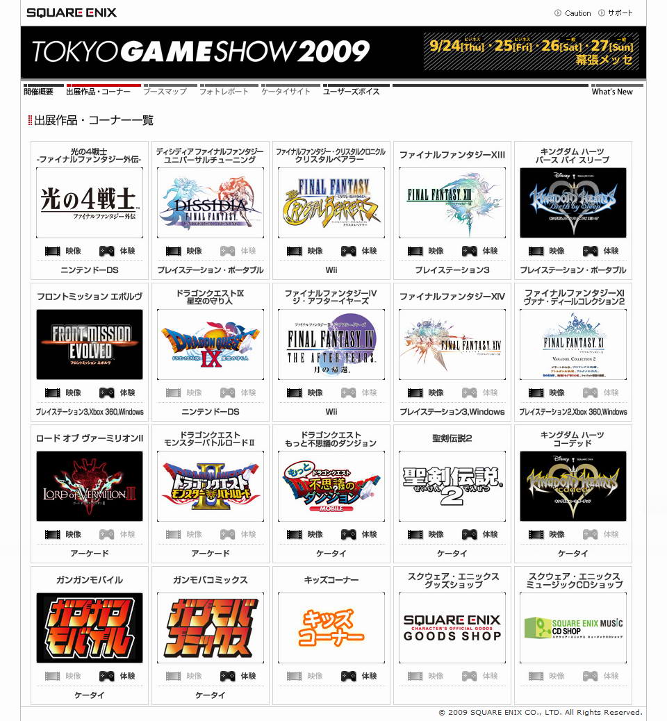 SQUARE ENIX 於 9 月 1 日正式開設「2009 年東京電玩展」特設網站,公布即將於 9 月 24~27 日在東京電玩展中展出的部分遊戲名單與相關展出資訊,供玩家參考。