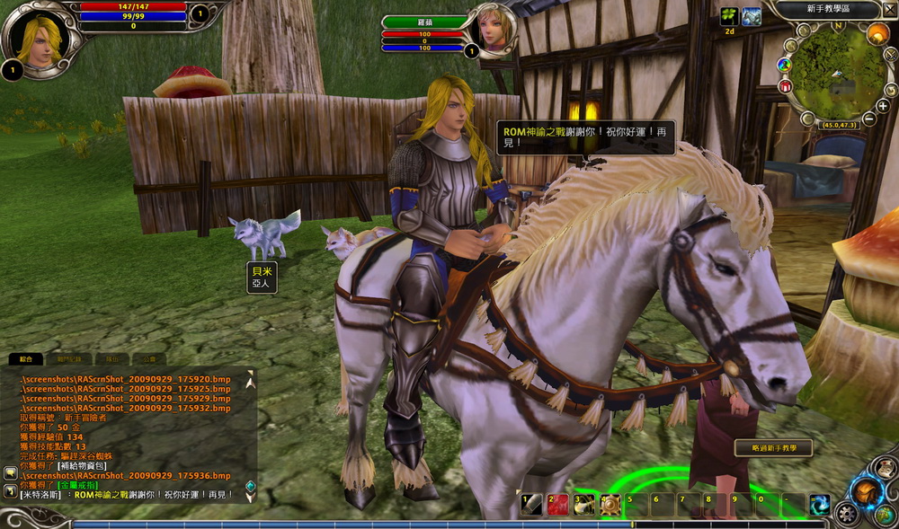 進入遊戲後,先別急著打怪,系統會先詢問玩家要不要參加新手教學,這可是有獎勵的喔。除了簡單的移動、攻擊教學外,這個教學副本也不是讓玩家打打幾隻小怪就結束,最後還會出現第一隻 BOSS 在這邊堵玩家,並使用特殊技能讓人物不受控制亂跑!不過這畢竟是新手教學,角色威能全開幾近無敵,沒兩三下就打趴 BOSS,然後就可以悠閒的觀看周圍美麗的景色,領取獎勵、騎著白馬準備體驗更豐富的遊戲內容。