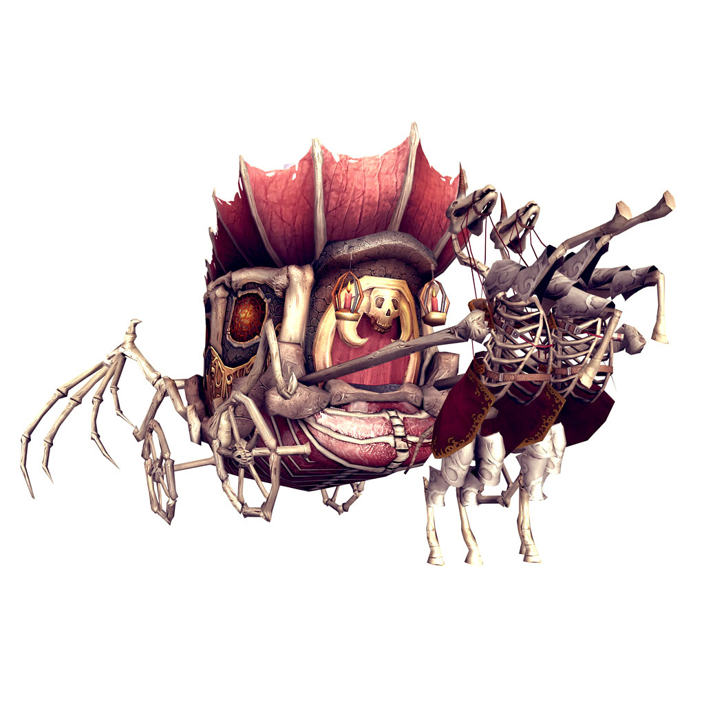 「馳奔八荒.骷髏馬車」就像它的主人一樣,給人瘋狂與神祕的感受。車頂寶珠燃著冥界之火,車廂由骸骨構成,連拉車的馬匹都是骷髏馬,奔馳於許昌石磚大道上時,一般的居民根本不敢正眼直視。