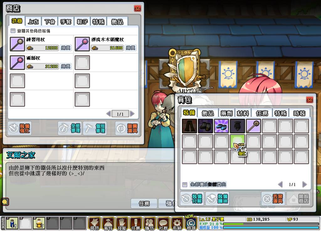 艾爾之光」時,記住要尋找美麗的冒險者助理「阿利爾」小姐,與她對話就能拿到「新手武器」以及技能(SP)點數 20 點的獎勵;想強化裝備或武器時,可以到新手村找 NPC「安安」對話進行「強化」功能,不過並非每次強化都會成功,成敗依照玩家的運氣好壞決定。