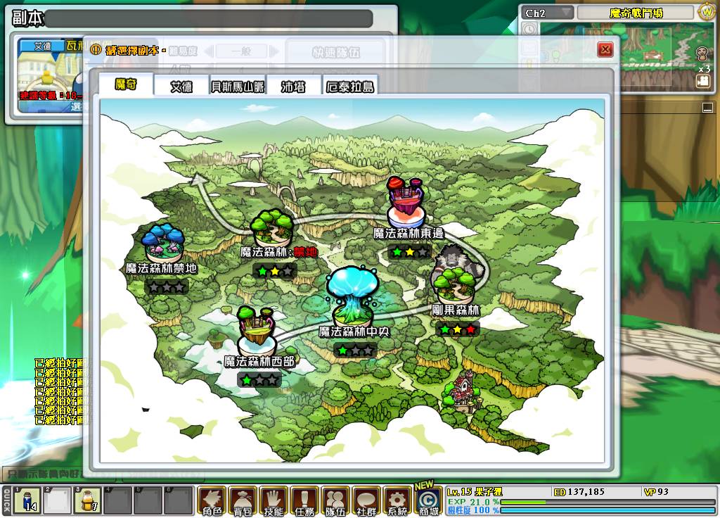 艾爾之光」冒險小隊。在「魔奇村莊」地圖中玩家先從「魔法森林」西部出發,經過中央、剛果森林、東部到北部。此外,秘密副本「魔法森林禁地」裡頭還有未知的 BOSS 等待玩家應戰。