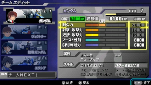 在 PSP 版原創的「NEXT-PLUS」模式中,玩家可以挑戰超過 250 種戰鬥任務,並使用任務過關所獲得的經驗值來提升 MS 機體等級。等級提升後除了 MS 機體的性能會隨之提升之外,並有機會獲得每台 MS 機體所各自擁有、能在戰鬥中取得優勢的「技能」。