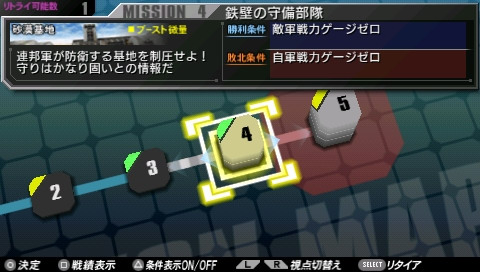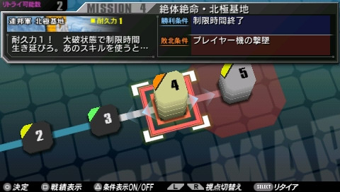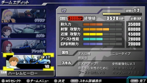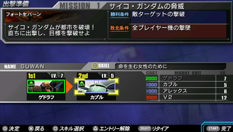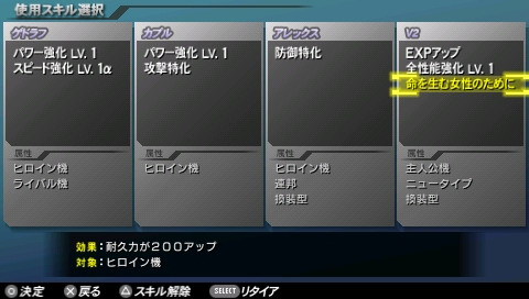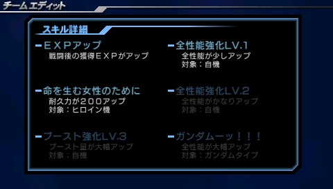 每次執行任務時都可以從取得的技能中挑選 1 種來裝備,玩家必須視任務需求以及小隊成員的搭配來善加選擇。例如 V2 鋼彈的技能「為了能孕育生命的女性」可以讓所有女性駕駛機耐久力增加 200,因此在編組小隊時除了 V2 鋼彈以外的機體可以全部都挑選女性駕駛機,如此一來就能讓大部分小隊成員獲得耐久力加成,充分發揮技能的效果。