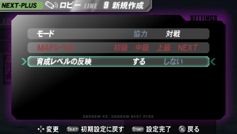 除了單人遊玩之外,NEXT-PLUS 模式也支援 Ad Hoc 模式 2 人連線合作 / 對戰。連線合作時 2 人可以一同挑戰選定的任務,包括地圖與難度都可以自由設定。連線對戰時 2 人可以使用各自培育的機體來遊玩對戰任務,培育的成果會反應在機體的能力上。