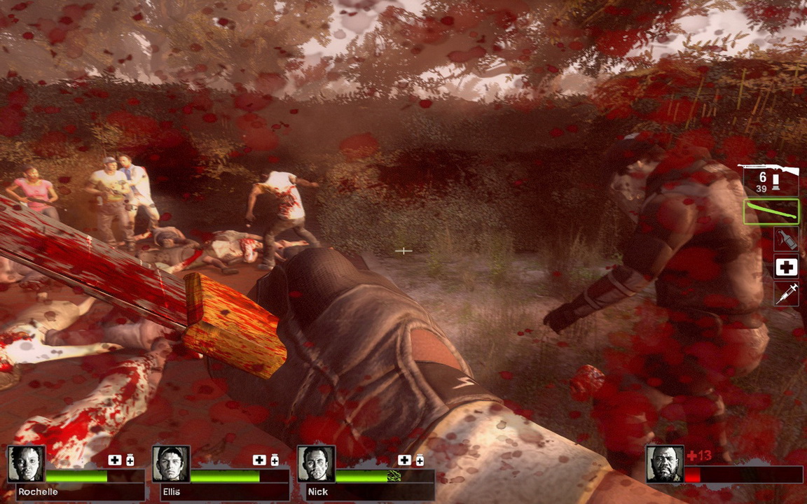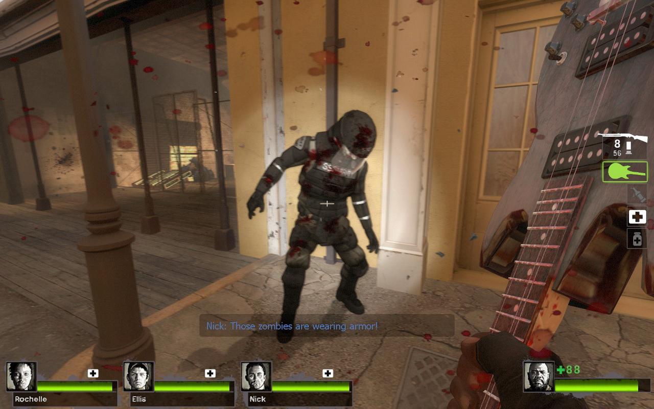 要不然,乾脆拋棄手槍吧!來點刺激的肉搏武器如何?電吉他不只在舞台上充滿搖滾魅力,拿來打人更是威力驚人,打倒殭屍的時候還能聽到些許的琴聲呢!如果喜歡平底鍋,也可以用力的往殭屍們的頭上敲上一記,保證讓他們眼冒金星!警棍雖然也是不錯的選擇,但還是比不起拿開山刀唰的一刀砍下去那般暢快無比!試玩版本中尚未出現在預告片裡登場的電鋸或是消防斧等等,想體驗完整樂趣、歡樂滿點的殺人玩意,可得再忍耐一下,耐心等候遊戲正式版的推出。