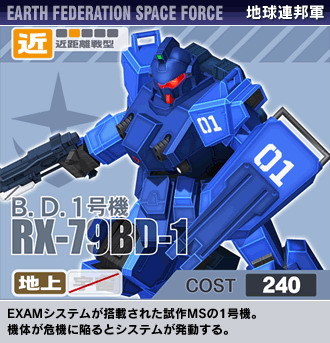 有「藍色命運」之名,在陷入危機時會自行發動俗稱「NT殺手」的「EXAM」強化系統之名機。在大型電玩版當中,當玩家機體的耐久值陷入紅血狀態時,就會自行發動該系統一旦發動後機體的機動性會獲得大幅的強化,當中最值得注目的是推進器的充填速度,快到能連續踩踏都不用擔心過熱,就連其他更高COST的頂級機體也望其項背。而在支給完成的一般狀態下,該機體擁有具優秀誘導性的牽制用副武裝,泛用的機槍,輕快的機動性,使其不需刻意依賴EXAM系統也能輕易為陸鋼的上位互換版機體。