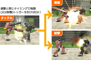 遊戲系統中原本衝撞之後對方一定會倒地,但現在這兩台機體可像格鬥機連段一樣,在衝撞後拔槍射擊,或是衝撞後直接帶入三連擊連段,亦可衝撞→故意射偏→再衝撞。以夏亞專用薩克來講,就是九陽霹靂狂龍,瞬間可以連發數計60傷害的踢擊重創對手,讓對手在猜拳狀態下更加感受到衝撞帶來的壓力。