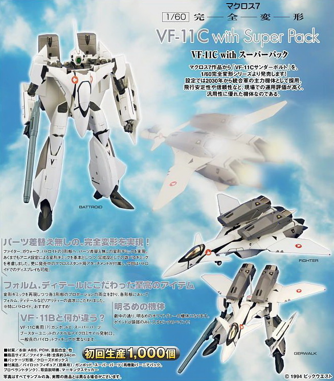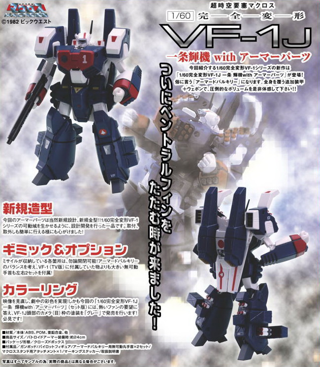 「1/60完全変形 VF-1J 一条輝機 with アーマーパーツ」 發售日期:11 月 製作單位:やまと 定 價:15876 元(日幣) | 「エヴァンゲリオン ヘッドコレクション 初号機」 發售日期:11 月 製作單位:セブンツー 定 價:9261 元(日幣) 備 註:全長約 250 mm | 「SUPER ARMORED FIGHTING SUIT S・A・F・S」 發售日期:11 月 製作單位:メディコム・トイ 定 價:126000 元(日幣) 備 註:全球限定 600 組 | |||