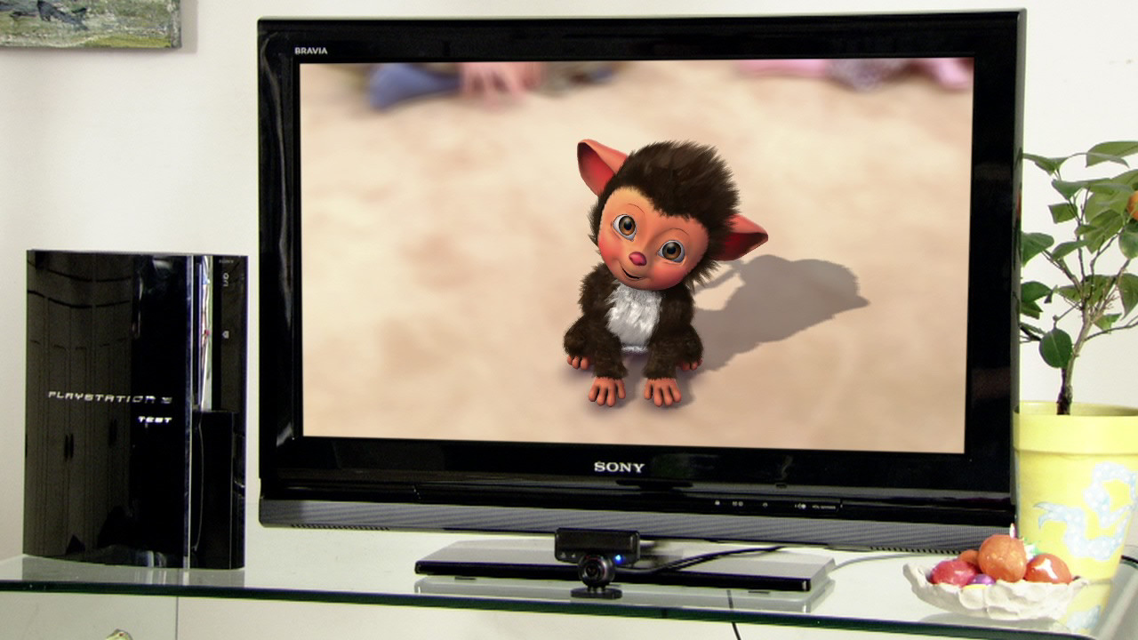EyePet 》大大的眼睛,貌似猴子的趣味身形,即將在今秋攻佔你家螢幕。本作使用了「擴增實境(Augmented Reality)」技術製作,並透過 PS3 專屬的「PlayStation Eye」視訊攝影機,讓玩家也可以跟生活在虛擬世界裡的