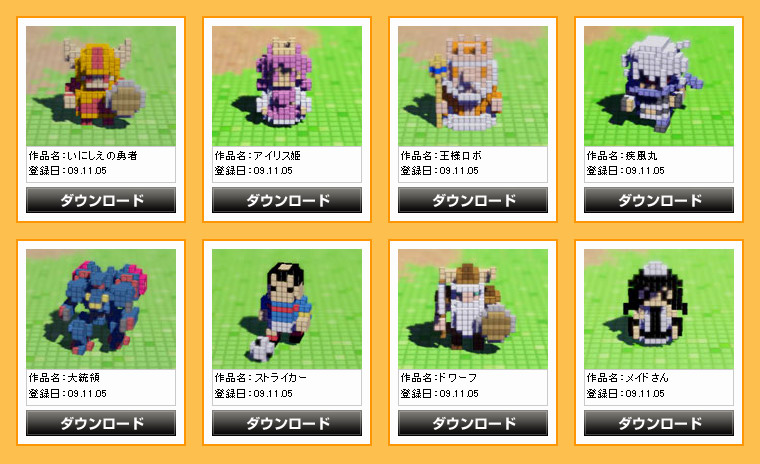 官方網站為了慶祝遊戲推出,特別於發售當日釋出 8 種透過角色編輯模式製作的 3D 點陣角色造型供玩家下載使用,其中包括古代勇者、艾利斯公主、國王羅伯等遊戲登場角色,以及疾風丸、大總統、足球員、矮人、女僕等來自其他遊戲或是原創的角色。