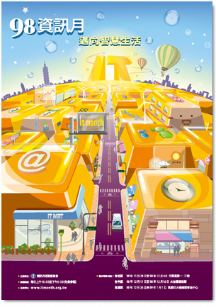 98 資訊月主題館以未來城市為概念,展出觸控、電子書、人性化操作與 3D 立體娛樂等新科技的應用,分為「未來書城、「3D 未來夢想館」、「精采創新館」、「3D 觸控科技館」、「3D 娛樂視界」與「網路娛樂中心」6 大區域,呈現智慧生活科技的面貌。