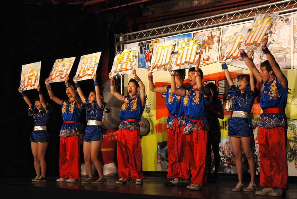 ![行政院新聞局劇情漫畫獎頒獎典禮會場]() | ![開場的啦啦隊表演為台灣漫畫加油]() |