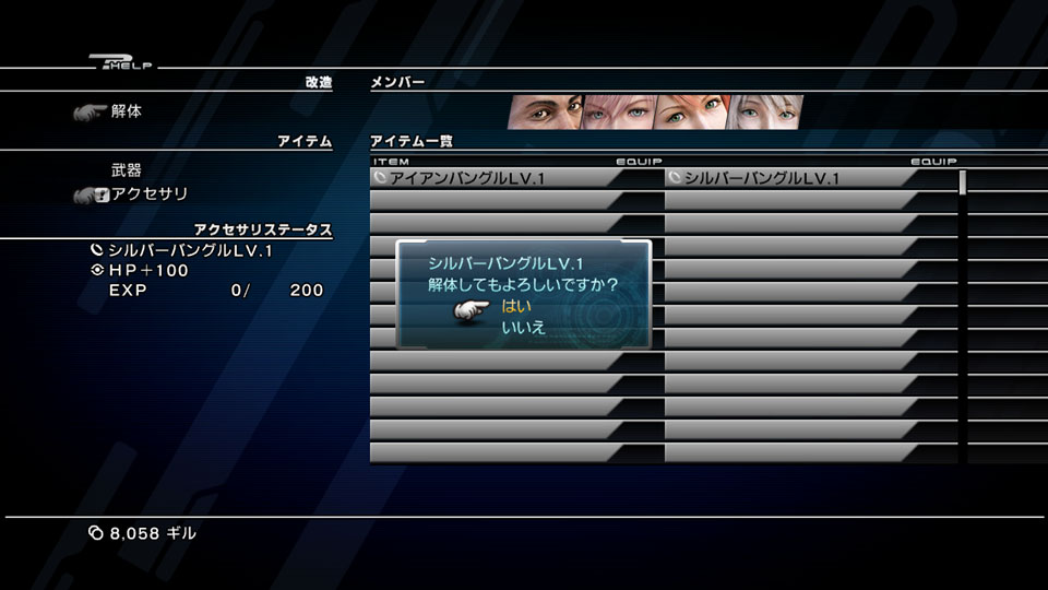 除了透過改造來強化武器與裝飾品之外,也可以透過「解體」來回收不使用的武器與裝飾品。解體後可獲得部分素材回饋,其中也有部分稀有素材只能透過解體獲得。