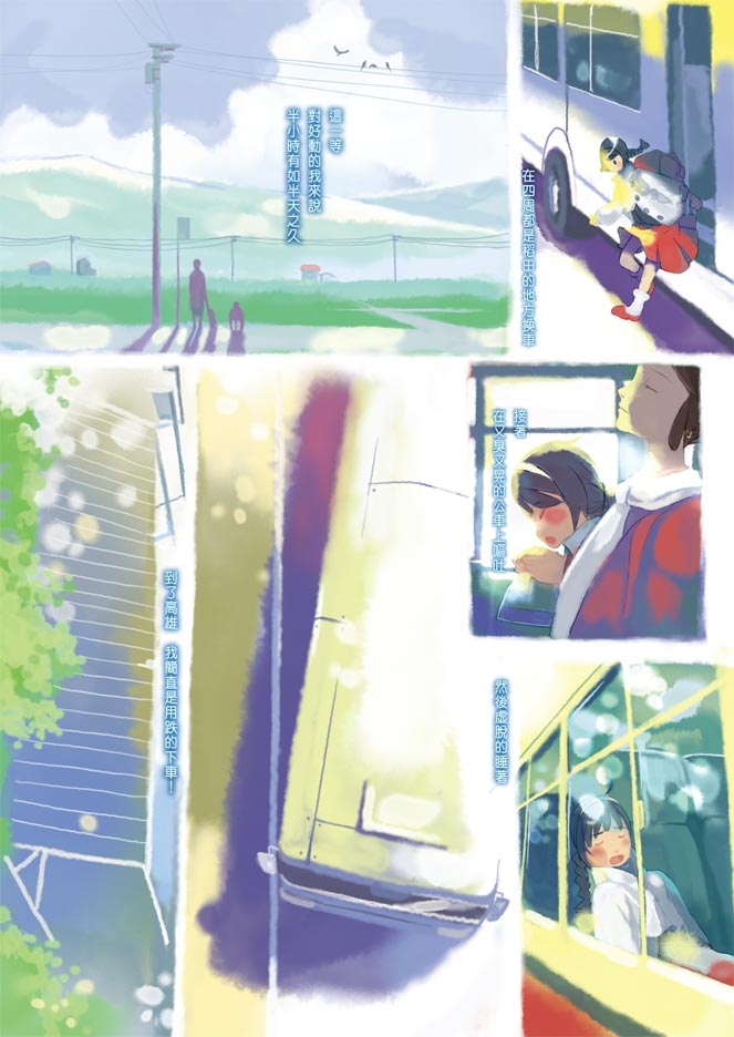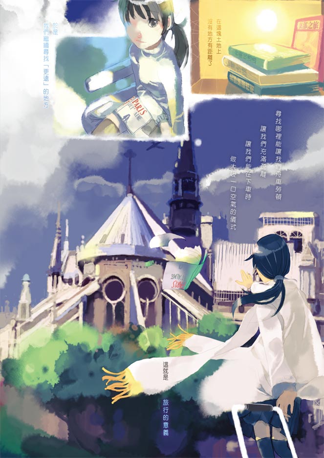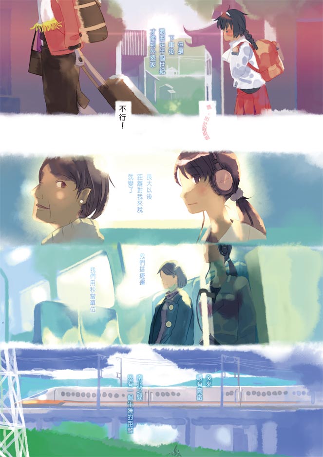 V:之前我曾於挑戰者月刊連載彩色短篇漫畫《Colorful Dreams》,採用融合插畫畫風與漫畫敘事的手法,以散文新詩的概念來創作,因此稱為「彩色詩畫(Color Illustory)」。以前我曾立志想當漫畫家,不過因為我比較重視畫面與氣氛,但傳統漫畫重視的是節奏感與分鏡,加上自己構思出來的劇情多半是以日常生活為背景,而不是什麼奇幻史詩鉅作之類的東西,因此我決定不走傳統漫畫風格,而是結合自己擅長的插畫來創作。