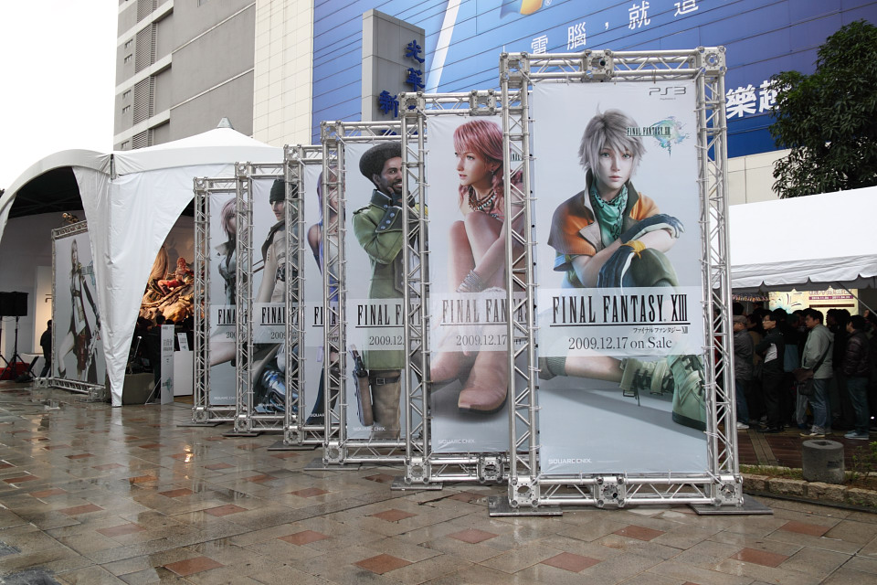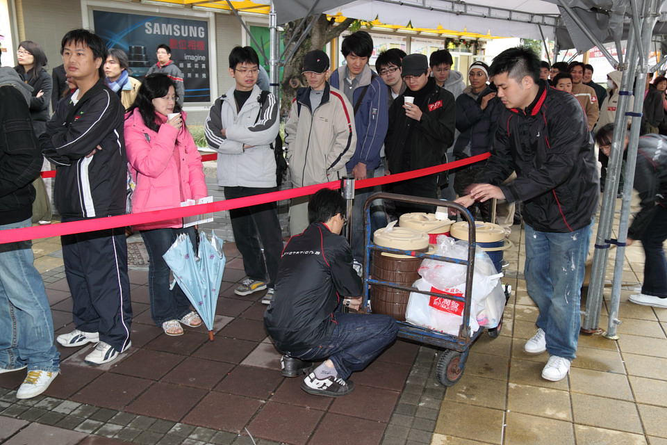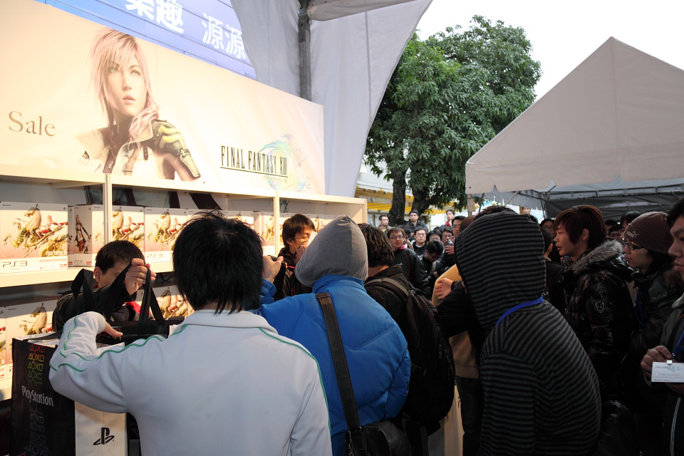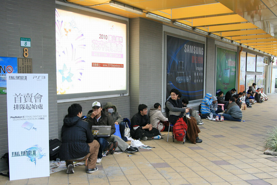 Final Fantasy XIII》特製 PS3 同梱組以及首賣限量特典贈品,特別在活動前 1 天就到現場排隊等候,準備好椅子、筆記型電腦、PSP 等應付漫長等待時間的裝備,不畏寒流徹夜排隊守候。