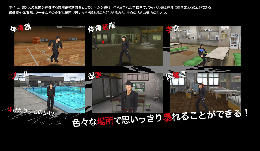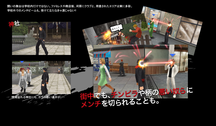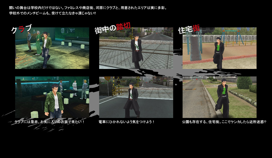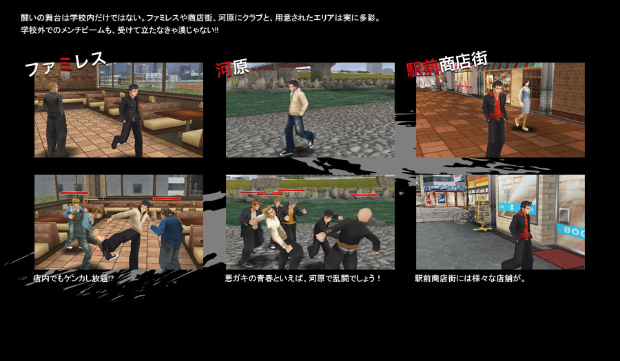雖然遊戲設定是以校園生活為主軸,不過學校之外的場所一樣也會成為戰場,不論是商店街、河濱地、家庭餐廳、寺廟等,隨時都可能因為一眼不合而展開激烈的幹架。