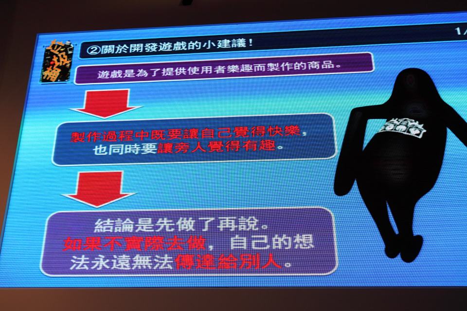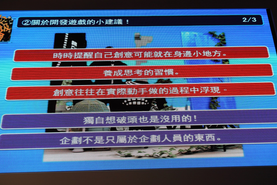 松田太郎現場也分享自己對開發遊戲的小建議,包括讓自己樂在其中也讓旁人覺得有趣,即知即行將自己想法傳達給他人,從身邊小處尋找創意靈感,養成思考習慣並透過動手做讓創意浮現,除個人努力外還必須重視團隊合作等,都是基本但實用的建議。