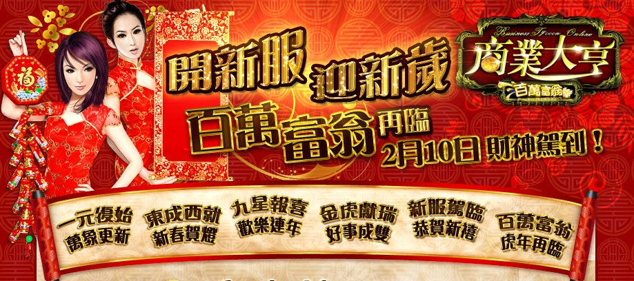 官方誠摯邀請各位大亨參加春茗飯局-「豪門夜宴」,一起慶祝虎年的來臨。在「豪門夜宴」中,各位大亨除了可以享受美味的佳餚外,更有機會參與新春大抽獎,虛寶拍賣會或是玩遊戲羸大獎!當日我們還會舉行「百萬富翁」活動的頒獎儀式。