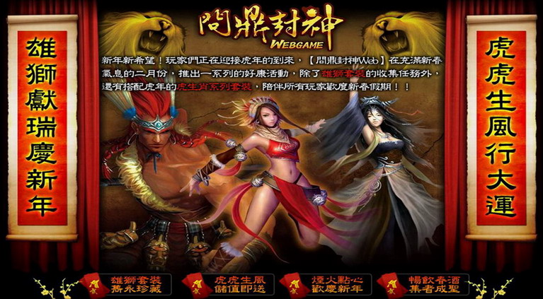 問鼎封神 Web》推出極品「雄獅套裝」,要來獅虎相爭,只要玩家集滿“慶”“新”“年”三個字道具,或是擁有足夠數量的點心、煙火,就可以兌換雄獅套裝。寅虎系列生肖套裝也同步出爐,只要儲值達一定金額就可獲得!
