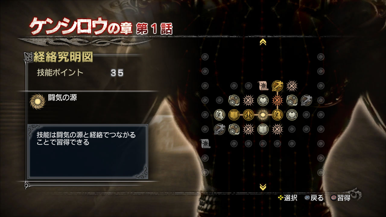 「經絡究明圖」是本作特有的角色培育系統,代表角色的經脈走向與潛在能力。每個角色都有各自的經絡究明圖,玩家可以在經絡究明圖中使用戰鬥中獲得的「技能點數」來學習具備各種效果的「技能」或是強力攻防招式的「傳承奧義」。其中技能又分為學會後就能發揮效果的「自發技能」與裝備後方能發揮效果的「裝備技能」。