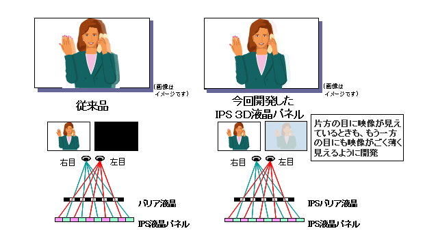 本次發表的 3D 液晶螢幕採用主流的視差屏障式設計,並以 IPS 液晶面板作為視差屏障,透過電極構造的特殊設計,讓一邊眼睛也能隱約看到另一邊眼睛的影像,藉以減低視點移動時影像重疊的現象,抑制眼睛的疲勞感。