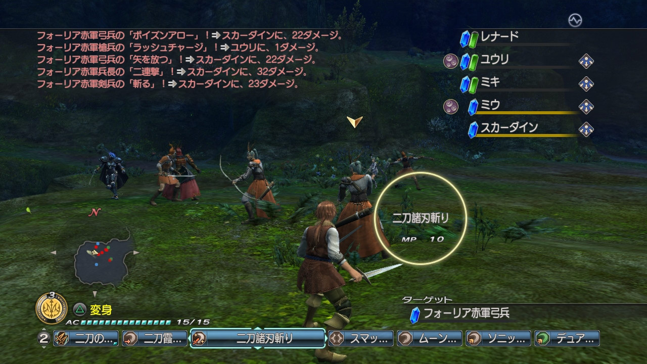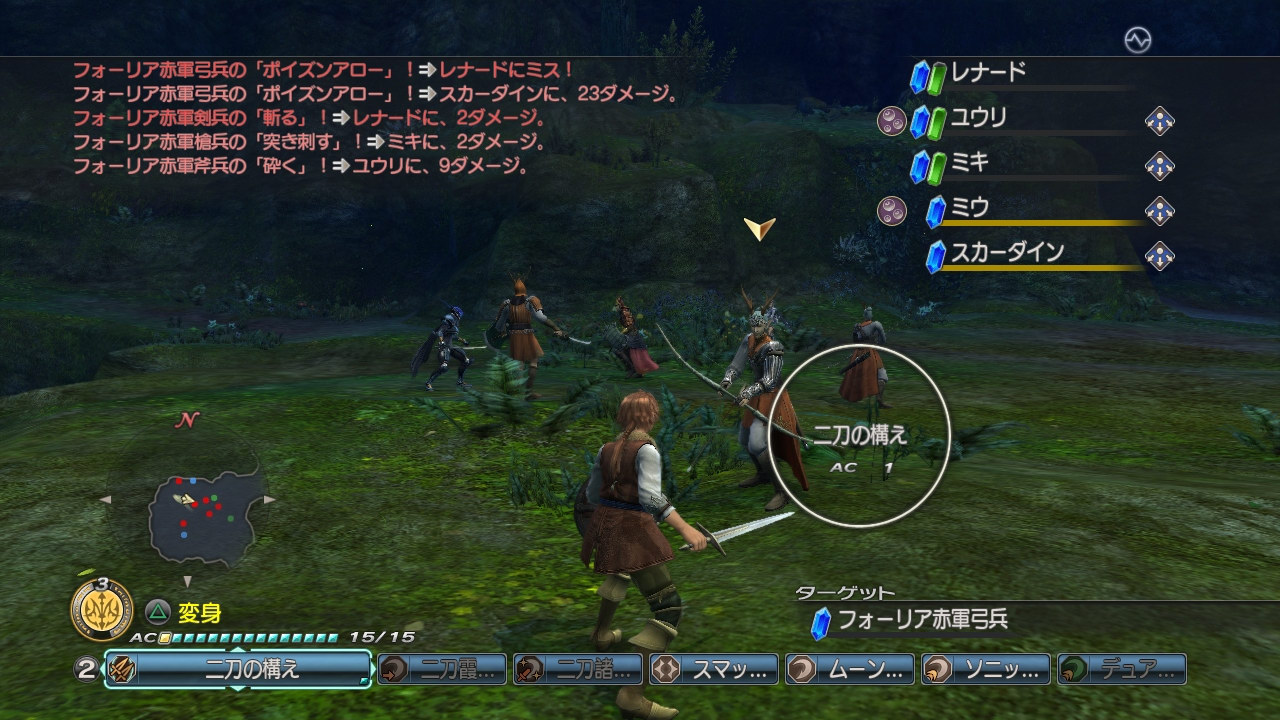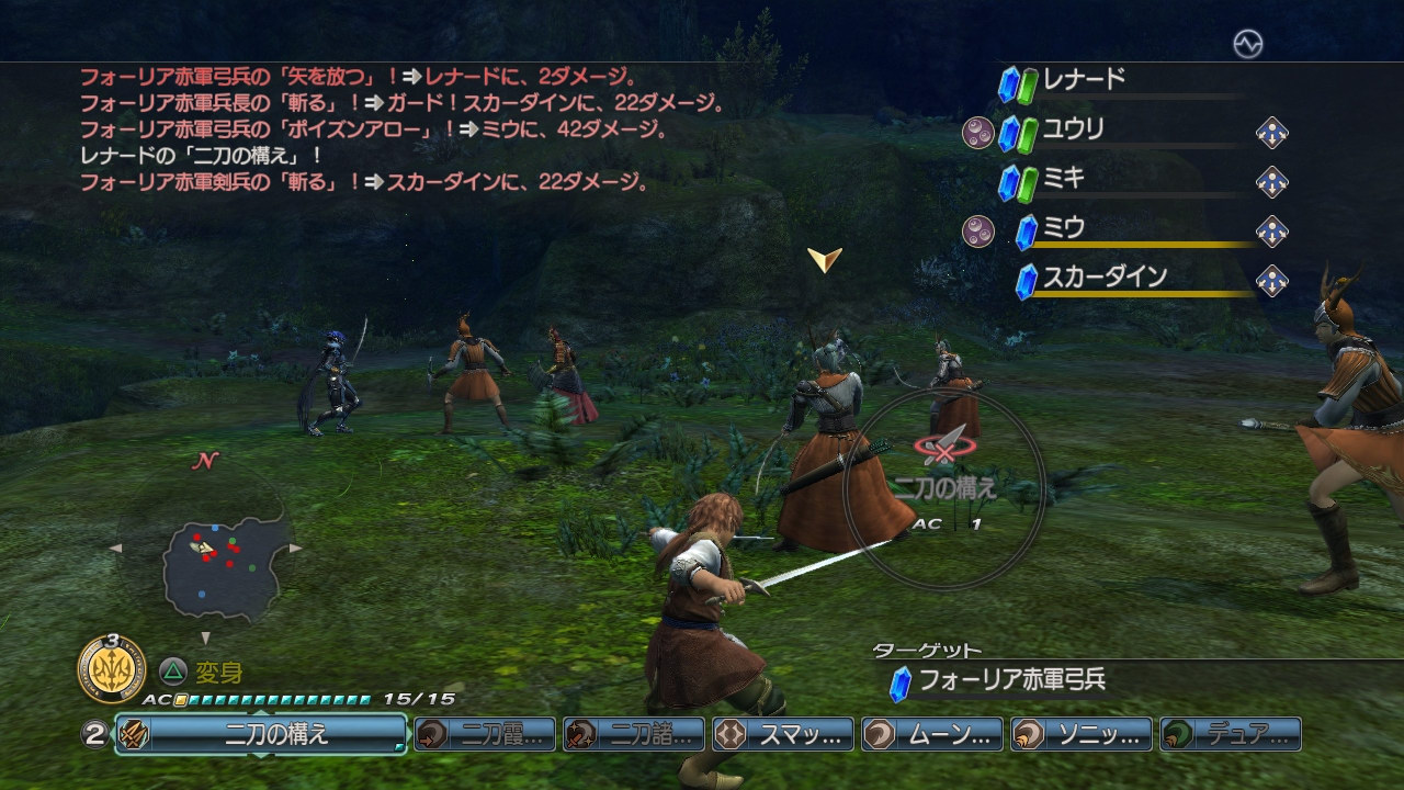 「雙刀架式」是單手劍特有的新技能,學會後就能在「指令板」上使用雙刀流的攻擊招式,或是從一般持劍與盾的狀態任意切換為雙刀流並施展雙刀專用的技能。雙刀流攻擊的威力會比一般攻擊強,不過切換到雙刀架式時必須耗費一定的 AC 與 MP 為代價。