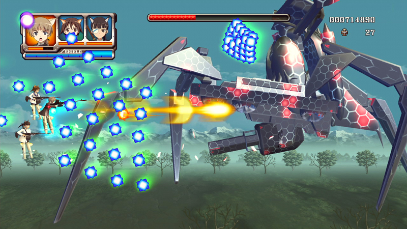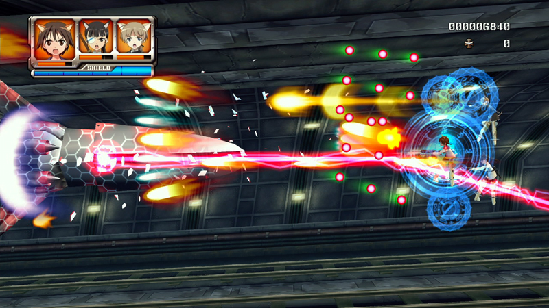 遊戲採橫向捲軸射擊玩法,以 3 名角色組隊進行戰鬥,戰鬥中可視狀況變換隊形。