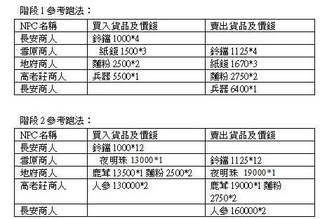 要維持一個幫派的營運,最佳的方法就是解跑商任務了。玩家只要等級到達35級或以上,就可以從「幫派」中的“白虎長老”獲得跑商任務。跑商任務因應玩家的等級分設了2個階段。35至44級為階段1,起始資金為$4000,以$6400為目標金額;45級以上為階段2,起始資金為$12000,以$30000為目標金額。接取任務後,玩家就可以穿梭各地,跟當地的商人打交道,低買高賣來完成跑商任務。以下為大家提供一下簡易跑商流程作參考,希望大家早日完成任務。