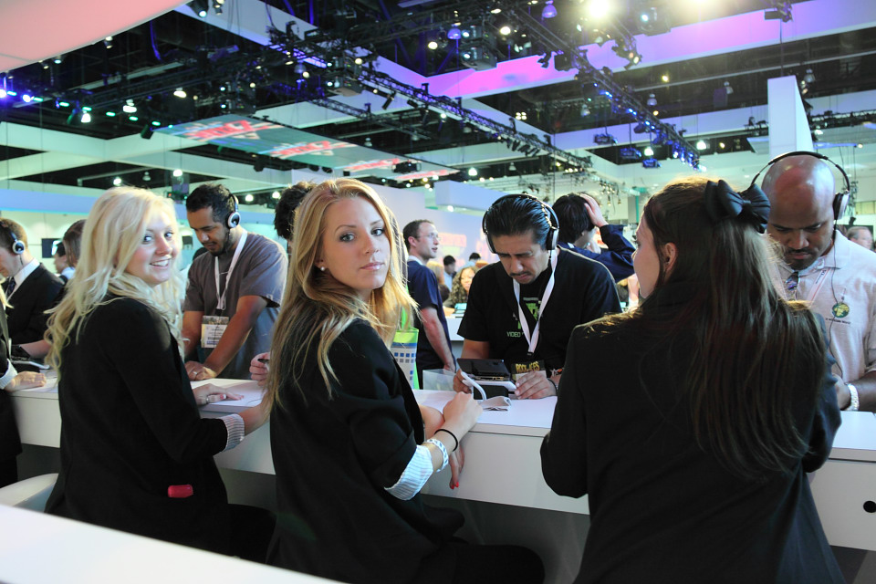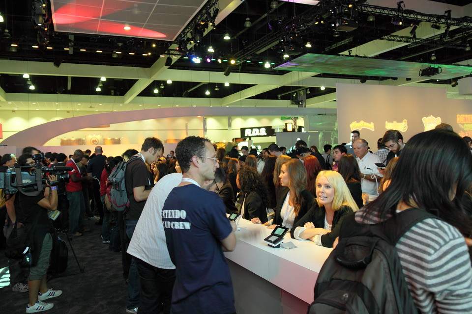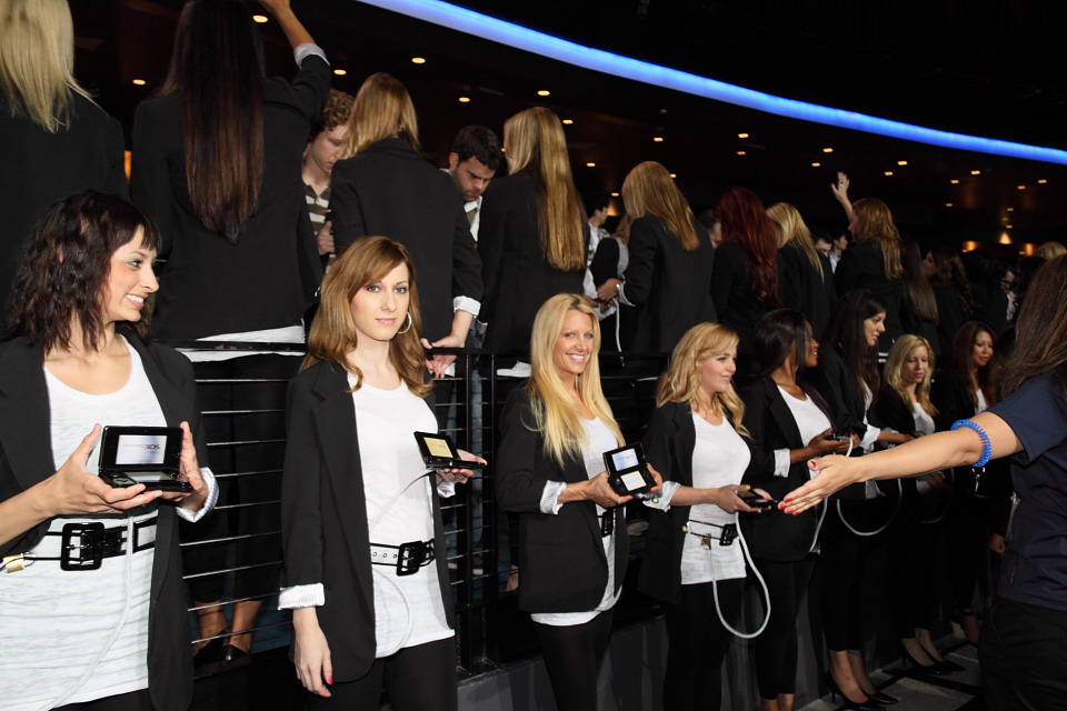 任天堂美國總裁瑞吉‧費斯艾米(Reggie Fils-Aime)在展前發表會尾聲時表示,為了彌補與會者無法透過大螢幕觀賞到 N3DS 的 3D 立體顯示效果,因此特別請出上百名龐大陣容的展示女郎人手一台 N3DS 供與會者親自體驗。現場展示的是互動式的示範畫面,輪流顯示瑪利歐、皮克敏、庫巴、薩爾達、薩姆斯等任天堂招牌遊戲角色的 3D 立體畫面,可透過新增的類比墊來控制視角、3D 微調滑桿來調整立體感或關閉 3D 立體顯示。