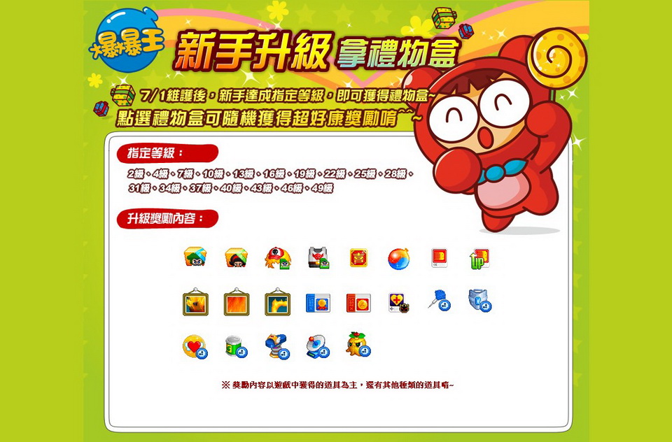 爆爆王》7 月 1 日改版後,新手升級獎勵將同步更新,好康更是獎不完!只要玩家達成 2、4、7、10、13、16、19、22、25、28、31、34、37、40、43、46 及 49 級等指定級等,即可獲得禮物盒,點選禮物盒將可隨機得到「飆風ㄚ瘦」、「優雅小蜜桃」、「歡喜樂爆卡」、「八卦螺旋丸水球」、「移行幻影」、「移行幻影加強版」、「ㄚ瘦愛情啦啦隊套裝」..等道具,提供給新手玩家最具趣味的體驗。