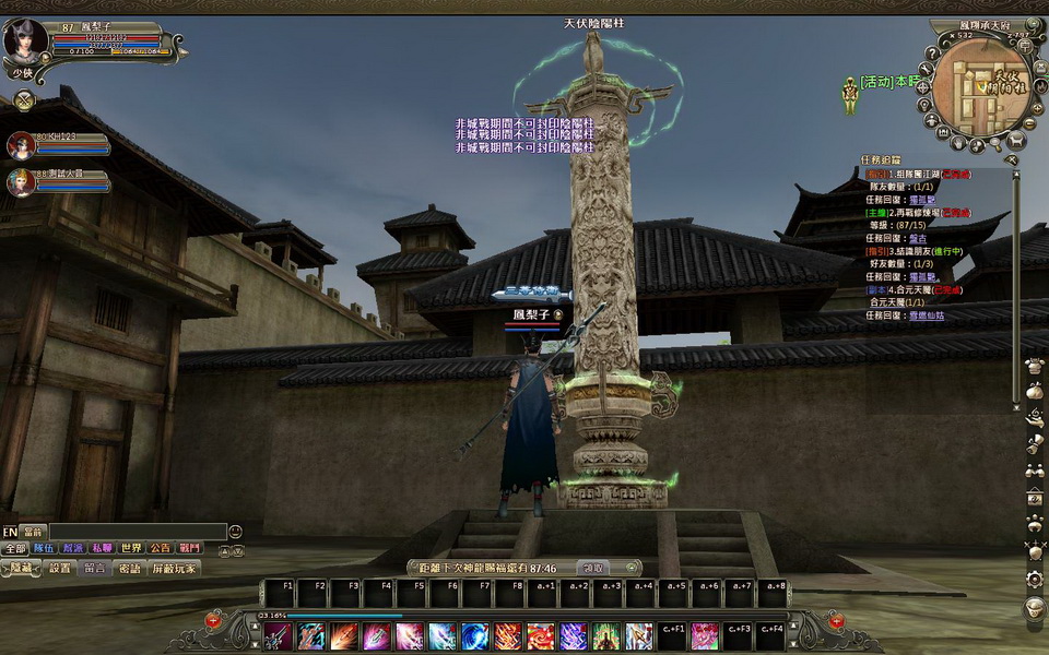 各幫派只要等級達到 2 級、幫主達到 60 級,就能申請管理幅員廣大的「禁城」。各城城門是防禦敵方至關重大的第一道防線,戰時,防禦聯盟可利用「青龍石料」和「白虎石料」修復城門、阻擋敵軍;非戰時期也能提昇城市防禦值,數值越高,城門就越牢不可破。「龍珠」是城戰中最前線關鍵的一環,只要進攻方先封印 3 根「陰陽柱」、再封印「龍珠」,就能得到城市的統治權。此外,各幫派還分別擁有一面能夠讓戰死的盟友重生「招魂幡」,不但能夠搶救戰死沙場的隊友,在一定範圍內,角色的體力和真氣也會快速恢復。