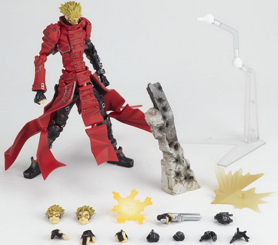 「リボルテック Series No.091 ヴァッシュ・ザ・スタンピード」 發售日期:7 月 製作單位:海洋堂 定 價:2400 元(日幣) 備 註:PVC、ABS 塗裝完成品,全高約 150 mm,約 26 處可動部位 |