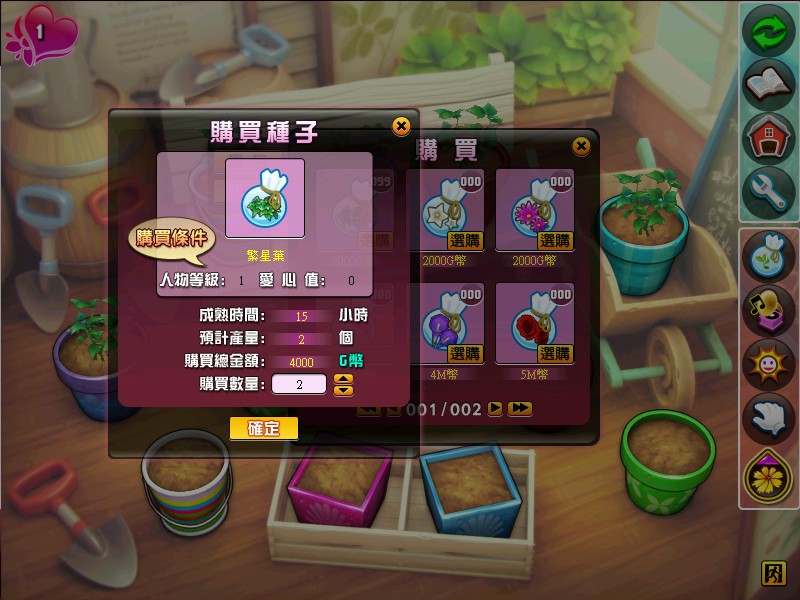 全新花圃系統讓玩家在家吹冷氣的同時,就能享受種花、賞花的樂趣,遊戲中,玩家除了可以體驗親手栽植的快樂,還可以到好友家的花圃替好友愛花灑陽光,讓彼此關係更加親密。種植出來的花朵還能夠製作成特殊道具,可以留著自己使用。
