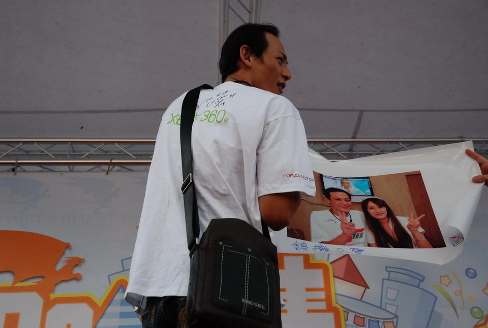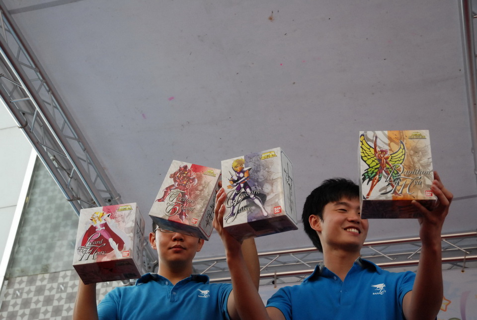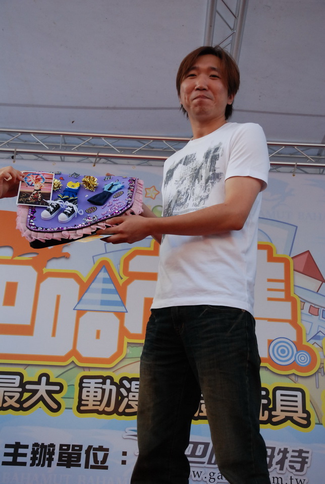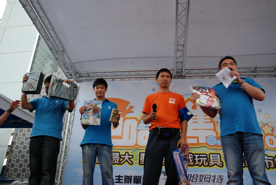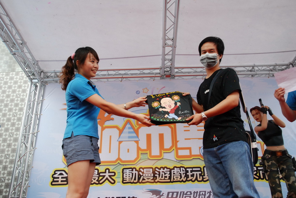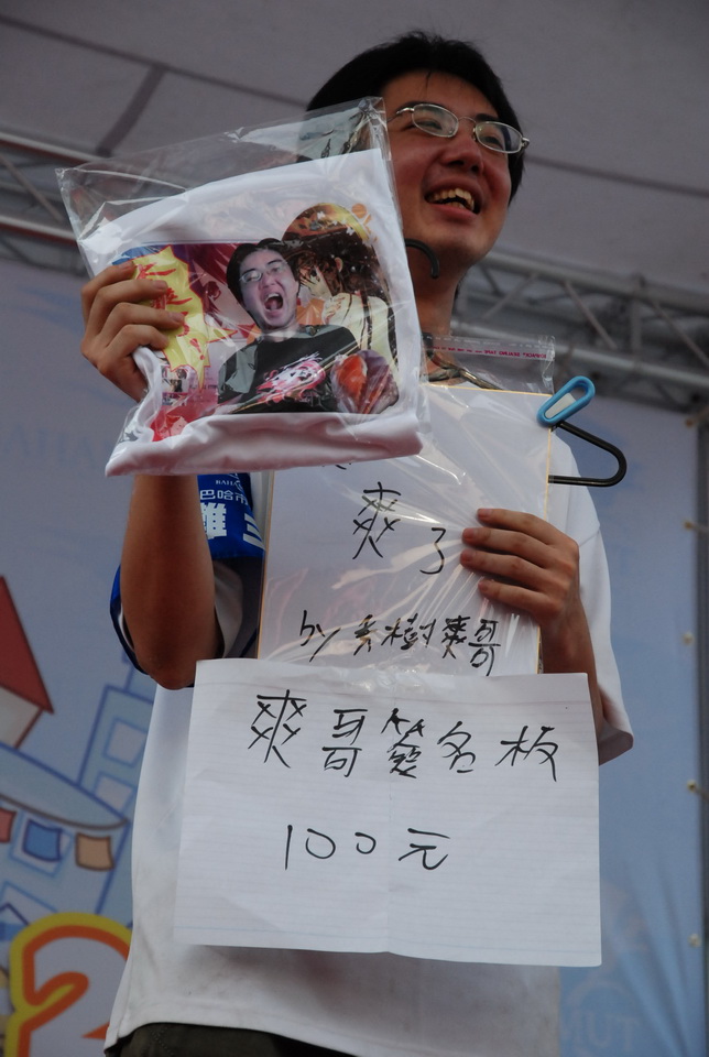 在緊接著 4 點半的攤主 Show Time 部分,包括了知名的「爽哥」上台義賣本人自製的 T 恤外,還有攤主表示從倉庫意外挖出來的大型機台看板一元起標,更有攤主一次祭出一組四尊的《