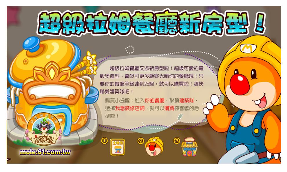 超級拉姆餐廳又添新房型啦!超級可愛的電飯煲造型,會吸引更多顧客光臨你的餐廳哦!只要你的餐廳等級達到 25 級,就可以購買啦!趕快聯繫建築隊吧!