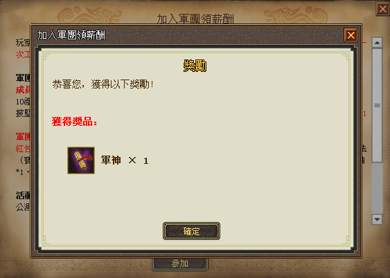 推翻原先獎勵規則(凡增加軍團人數達一定程度就可獲得獎勵,限領三次)!最新軍團活動,每天送您豐富獎品!人數天天達標準,獎勵就可天天領。