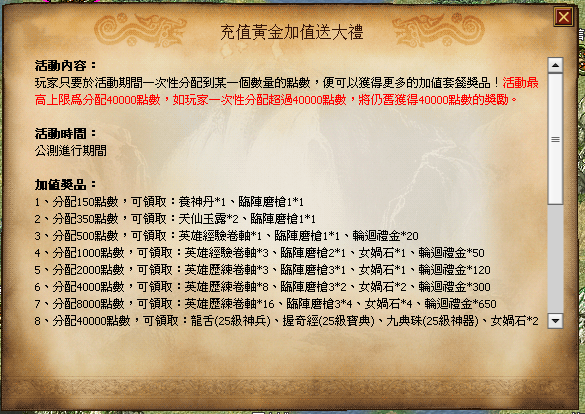 只要分配一定點數至遊戲中,官方將額外加送超值物品!在新伺服中只要達成條件,就立即送您英雄升級卷、女媧石等獎品,還有機會獲得頂級 25 級裝備,千萬別錯過這大好機會!