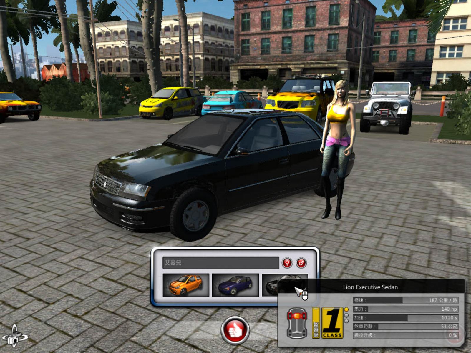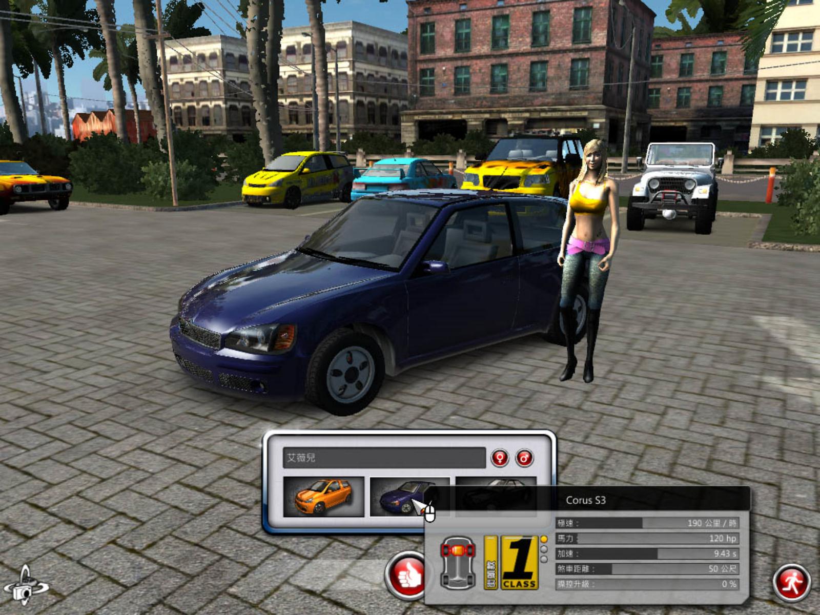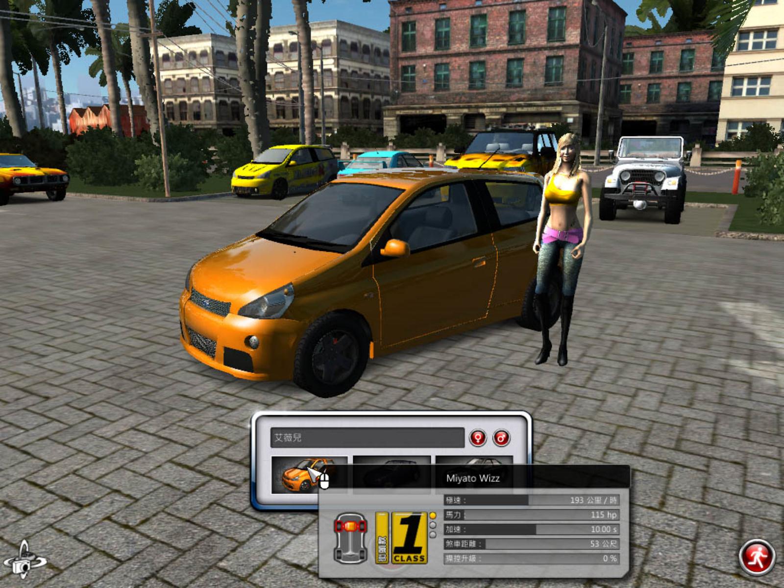 遊戲一開始,玩家可以先進行選擇人物的性別,同時在三台車輛中選擇自己喜好的新手車,將滑鼠移到新手車輛的圖示上,可以清楚看到每台車輛的各別性能,而所有新手車都是屬於前置前驅的車種。