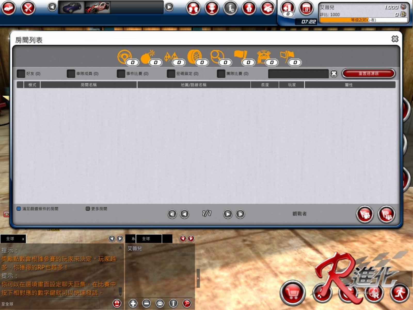 打開右上角的對戰房間列表,可以看到目前所有在進行的房間。遊戲在多人對戰模式中提供了豐富且多樣化的選擇,每種模式都有獨特好玩的地方,除了一般熟知的純競速模式外,也有如同馬利歐賽車使道具的戰鬥賽,考驗你的反應速度與心機,適時的埋下陷阱、攻擊對手及進行防禦。另外還有特殊的奪寶探索模式,讓一群線上的好友可以在開放式的地圖中恣意奔馳,只要收集到最多彩幣,就是最後的贏家。