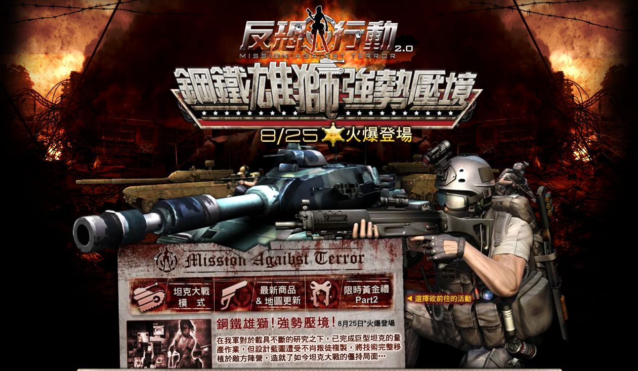 反恐行動 2.0 Online》戰鬥熱力不間斷,將於 8 月 25 日釋出「鋼鐵雄獅強勢壓境」更新。遊戲新增驚心動魄的「坦克大戰模式」,並搭配推出「南疆反擊戰」及「格魯賈兵變」兩張任務地圖,模式當中玩家可駕馭巨型載具坦克,使用強力的砲火攻擊敵方陣營,系統將依照分數高低區分勝負,玩家必須在最短時間內造成最大傷害,坦克絕對是不可或缺的利器!此外,遊戲並針對幽靈模式推出「南洋