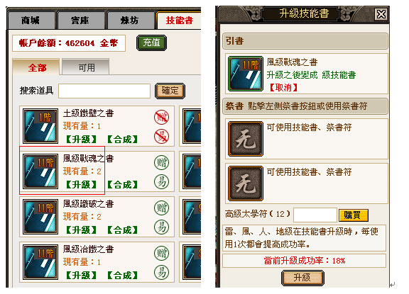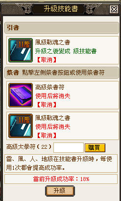 此時,技能書升級介面左側會顯示出此和技能書升級時,所有可用的升級道具,包括當做祭書的技能書和替代用的祭書符: